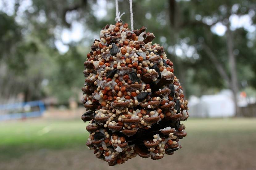 - Теперь подвесьте кормушку к ветке дерева и насыпьте в блюдца зерна.