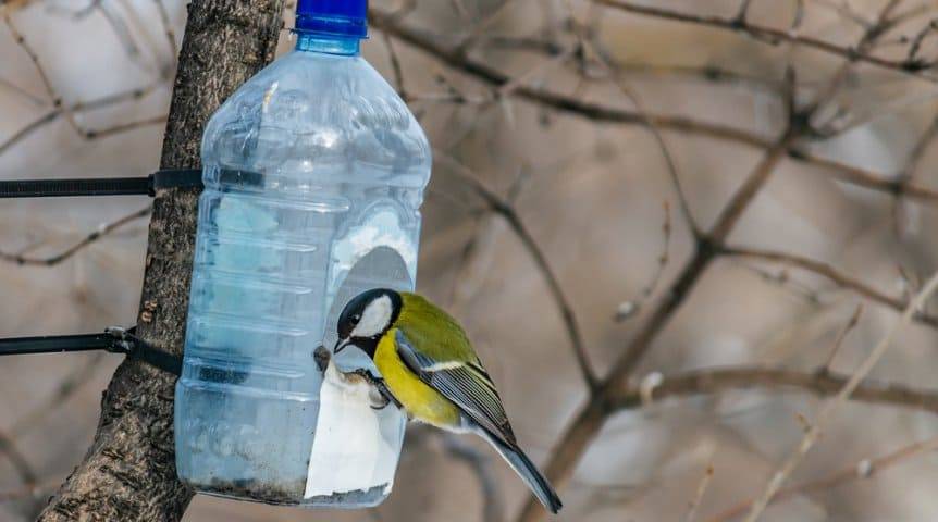 Также при необходимости можно сделать скворечник, используя простые пластиковые бутылки. Конечно же, такое изделие не подойдет для жизни птиц, но будет отличной кормушкой.