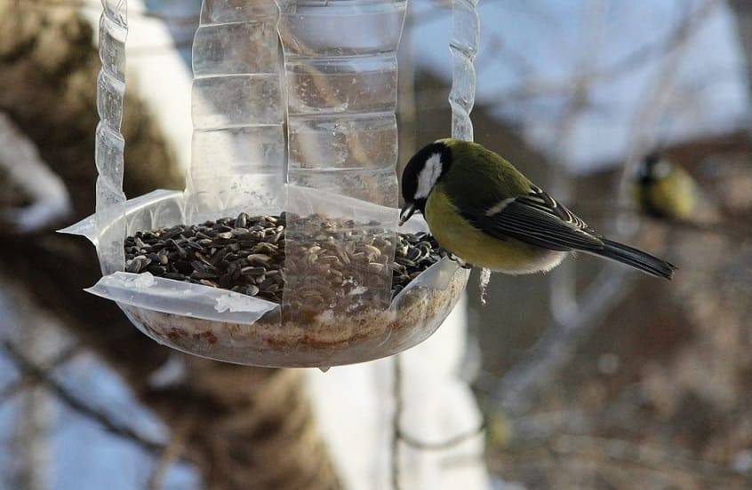 Еще одна идея легкой поделки. Обычную прозрачную бутылку 1,5-2 л наполнить зерном, крупой, закрыть крышкой и укрепить проволокой на ветке дерева горлышком вниз. Внизу бутылки проделать небольшие отверстия, чтобы пернатые могли лакомиться. Чуть ниже вставить длинные плотные веточки насквозь бутылки, чтобы удобно было сидеть и клевать. Так не нужна будет крыша, зерно будет само опускаться, вода не будет собираться на дне.