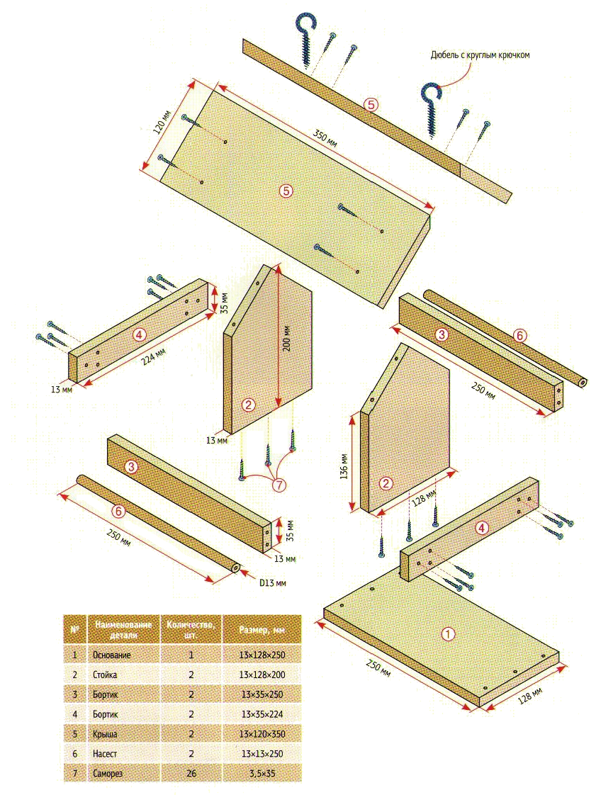 Простая в изготовлении конструкция, для которой понадобятся сосновые доски и фанера. Необходимые детали: основание, дно, боковые стенки, половинки двускатной крыши.