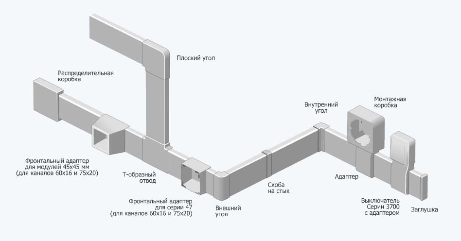 На этом этапе приобретают короба соответствующих размеров. Изделия нарезают по мере установки изделий. Нужно помнить, что каналы не комплектуются фурнитурой. Соединительные элементы придется покупать отдельно.