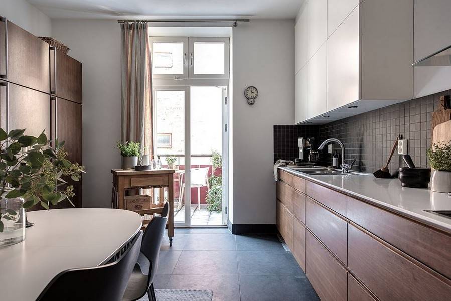 Несмотря на схожесть в планировке, все кухни с выходом на балкон различаются между собой. Отличия могут касаться как отделки стен и потолка, кухонной мебели и техники, так и общей цветовой схемы дизайна и стилистической направленности.