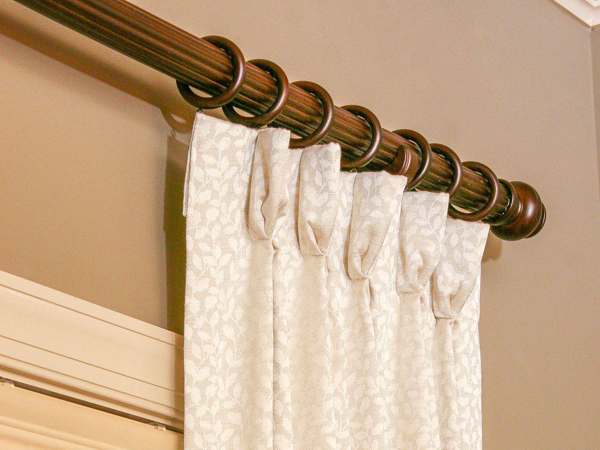 На настенном круглом карнизе хорошо смотрятся шторы с люверсами, одеваемые прямо на карниз. Но красивее выглядят портьеры на шторной ленте, которая крепится с изнанки, а в нее затем вставляются крючки.