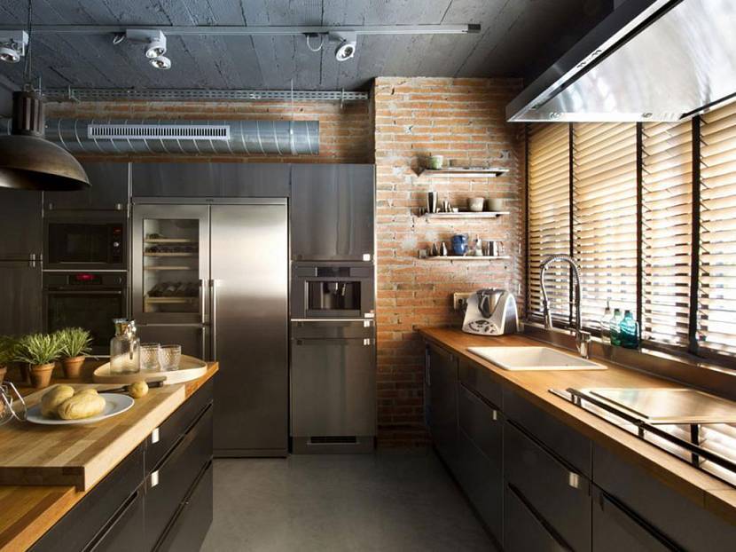Интерьер кухни в стиле лофт позволяет оставить окно без штор. Таким образом в помещении прекрасно ощущается заводская, городская, рабочая атмосфера.