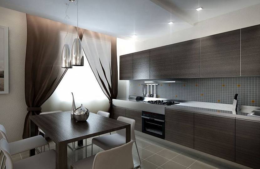 Чтобы сконцентрировать внимание на окне, можно навесить темные ночные шторы к настенному карнизу. Такие сочетания занавесок уместны на просторных кухнях квартир, расположенных на первом этаже