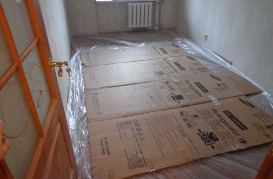 Если вы не планируете менять покрытие пола, его нужно защитить от возможных повреждений в процессе строительных работ. Для этого используйте плотную полиэтиленовую пленку, края которой нужно прочно закрепить при помощи малярной ленты. В случае запланированных масштабных работ, защищать пол от механического повреждения удобнее листами картона, которые намного прочнее пленки.