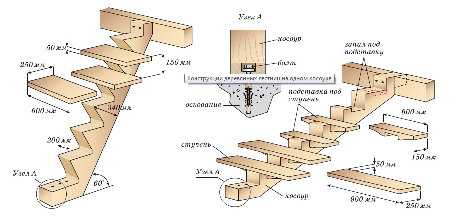 Конструкции деревянных лестниц на одном косоуре.