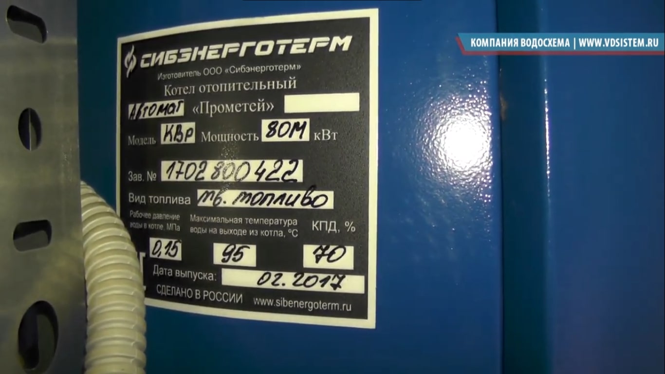 На шильдике котла мы можем видеть: 80кВт, заводской номер, твердое топливо, дата выпуска, КПД 70%.