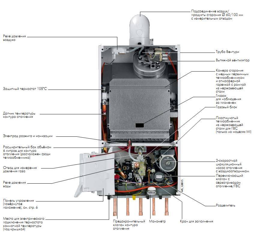Устройство на примере двухконтурного Сигнал S-Term. Самая простая конструкция теплообменника и отвода газов, отсутствие тепло- и звукаоизоляции, минимум органов управления.