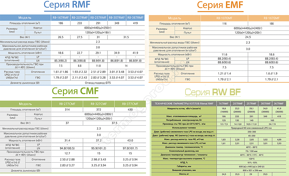 Производитель выпустил 4 серии: RMF, EMF, GMF, SMF. Каждая предназначена для эксплуатации в конкретных условиях. Например, газовые японские котлы фирмы Риннай RMF, способны обогревать помещение площадью 180–420 м2. К основным особенностям относятся: