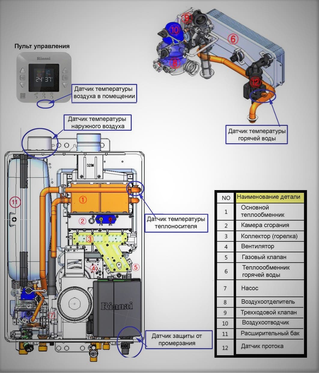 - Так как все газовые котлы Риннай – это двухконтурные настенные агрегаты, то инженерами компании были разработаны схемы и устройства работы прибора, которые помогали сэкономить потребления газа на 20%, когда котел переключал подачу топлива на работу системы ГВС.