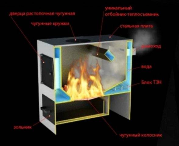 При покупке такого агрегата вы столкнётесь с аббревиатурой, которая имеет определённое значение. Так, КВО 10 ТПЭ означает, что это Котёл Варочный Отопительный, мощностью 10кВт, Твердотопливный, Плита варочная есть, Электроблок с ТЭНами.