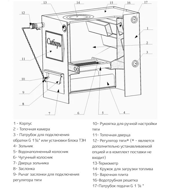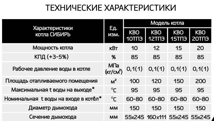 Диаметр дымохода котла Сибирь должен равняться 150-200 мм, мощность блока 2 кВт. Соблюдение всех технических требований при установке и эксплуатации обеспечивает стабильную работу котла. В качестве теплового носителя используют питьевую воду со значением ГОСТ 2874, жесткость которой не может превышать 0,7 мг. Вариант обрабатывания воды должна выбирать проектная компания. Помимо воды разрешается использовать бытовые тепловые носители, разрешенные для жилых помещений.