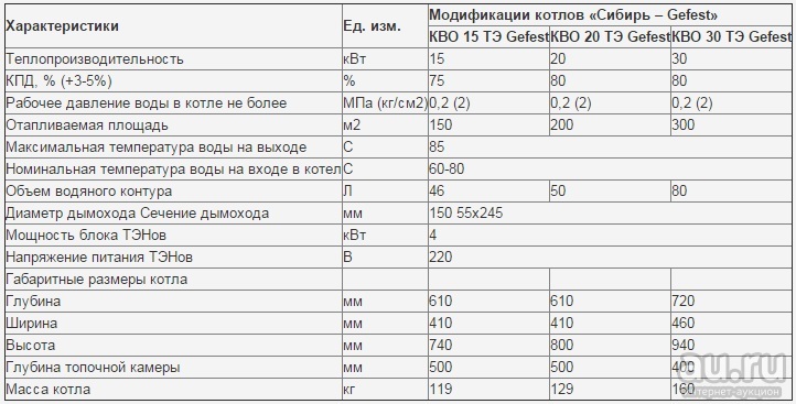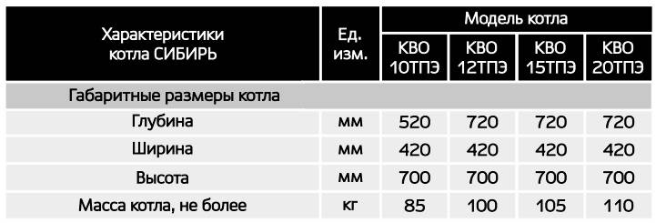 Таблица технических характеристик КВО СИБИРЬ
