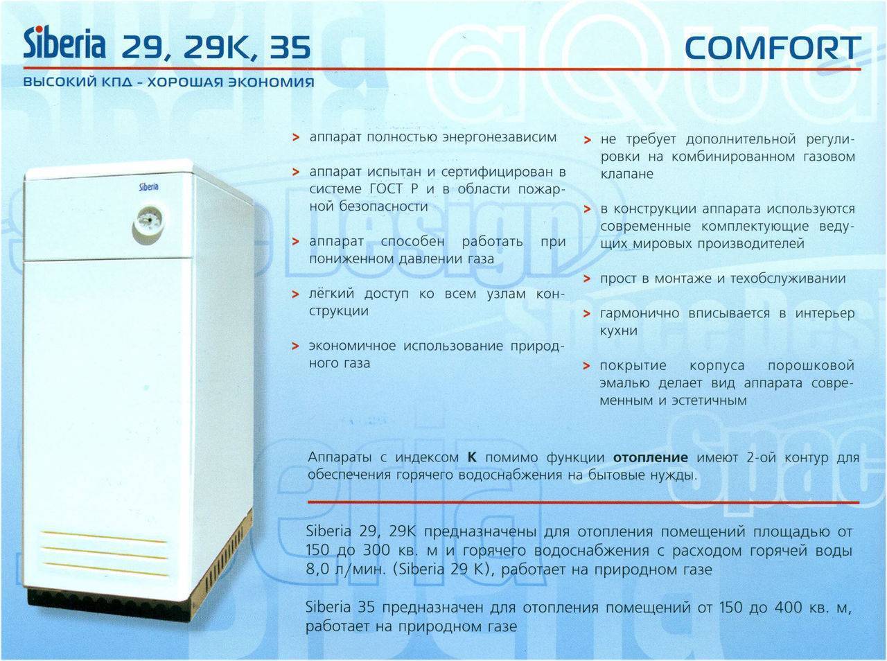 В целом, аппараты Siberia представляют модифицированную версию, известную в 70-х годах как АГВ-80 и АГВ-120. Новое оборудование получило современное, модернизированное оснащение. Последнее поколение приборов Сиберия, не боится скачков газового давления, не требует подключение к электросети, так как разжигается при помощи пьезоэлемента.