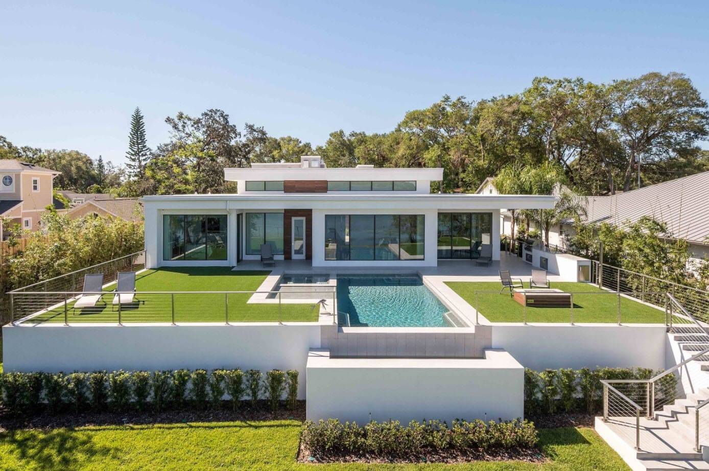 Большую роль в оформлении дизайна играет ландшафт. Очень аккуратно и строго смотрится ровный газон, подстриженные кусты. Красивый сад, пруд будут замечательным дополнением.