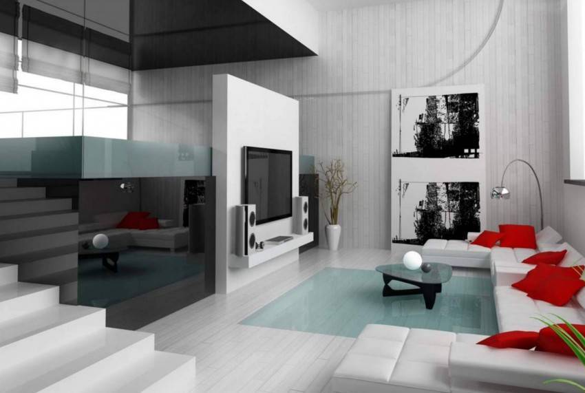Хай-тек – рациональное, напичканное техникой пространство, отсутствие натуральных материалов. Применяется стекло, пластик, жалюзи. Современное освещение светодиодами и мебельный минимализм, но с причудливыми формами.
