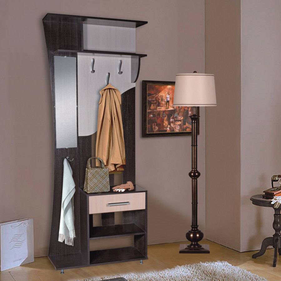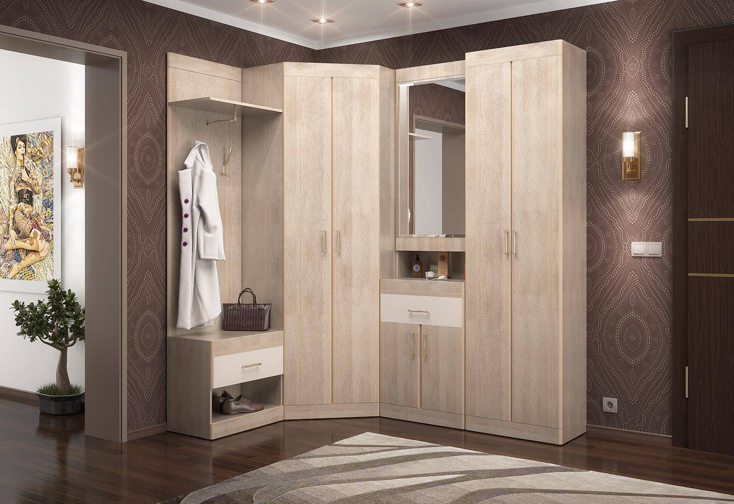 Если счастливый обладатель просторного холла или коридора, образующего угол в котором размещают элементы мебели открытого типа, то выбор среди готовых вариантов обширен. В угол поместится группа шкафов для длинной одежды демисезонного назначения, обувницу, стеллаж или вешалка на пять крючков.
