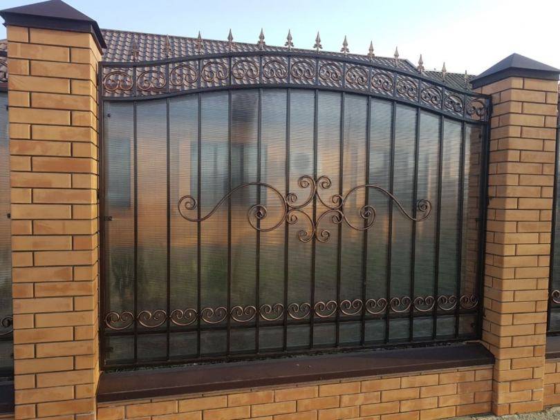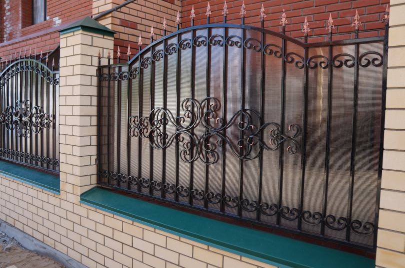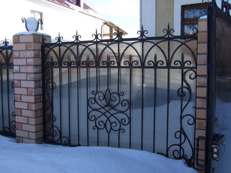 Кованый забор очень хорошо сочетается с различными материалами. Одним из оригинальных решений является комбинирование с поликарбонатом, так как он сможет исключить единственный недостаток созданного своими руками ограждения – просматриваемость. В этом случае ничего от соседей и прохожих не сможет скрыться. Установите полупрозрачный материал со стороны дома, чтобы на улицу выходил элегантный кованый рисунок.