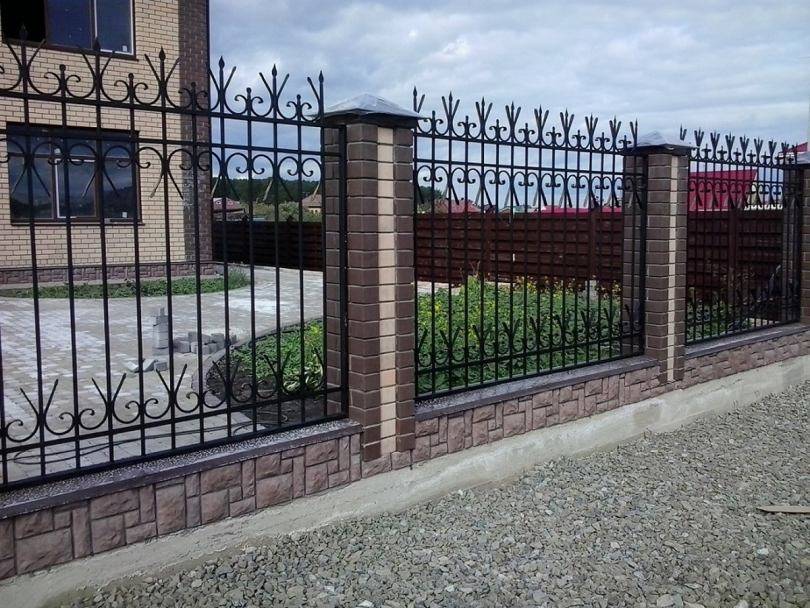 Можно сделать частично кованный, частично профилированный забор или добавить третий элемент из другого типа сырья. Возможно добавление кирпича, поликарбоната, сетки.