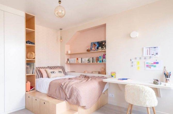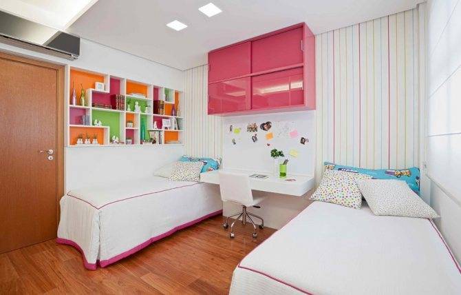 На фото детская для двух девочек с закрытыми полками с глянцевыми фасадами розового оттенка.