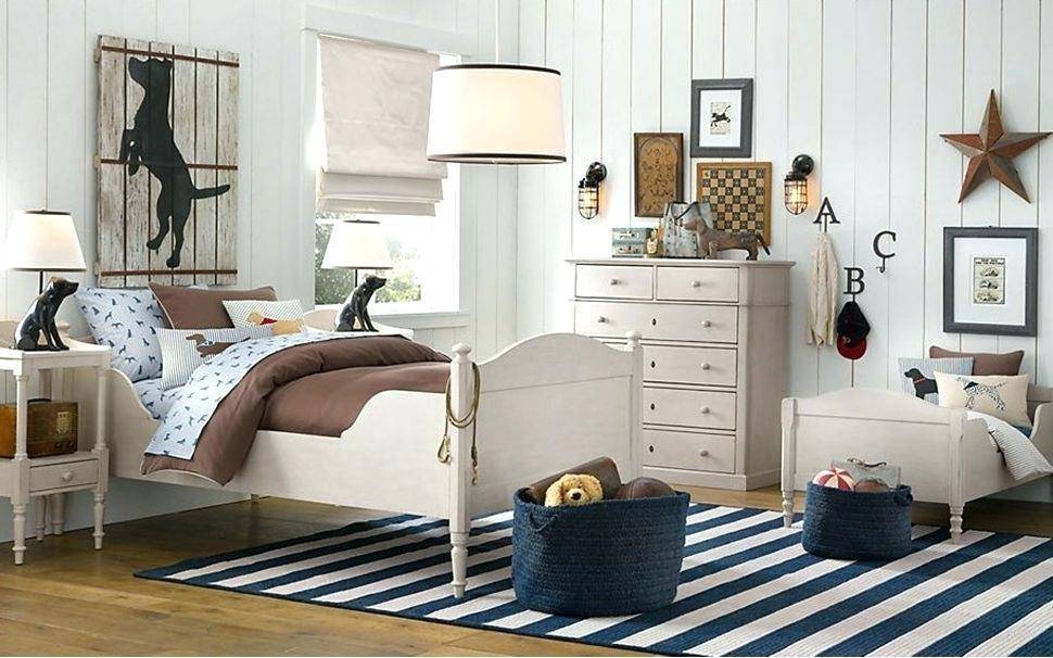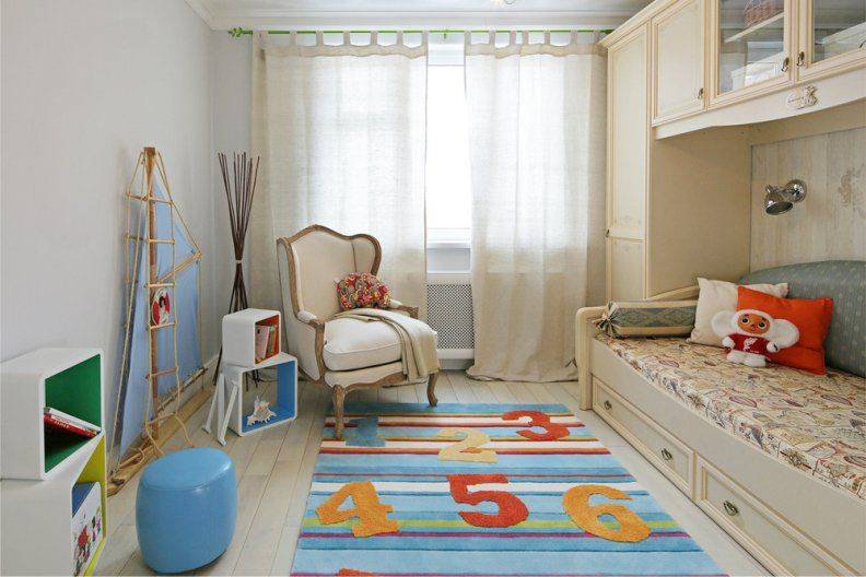 Ковер так же подобрать в таком стиле. На нем могут быть изображённые якорь и штурвал которые непременно вызовут восторг у малыша. Так же это могут быть машинки, рисунок дороги, на таком ковре играть будет очень даже интересно.