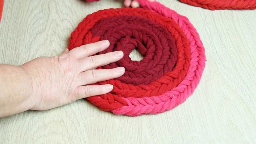 Уложить получившуюся длинную косу можно кругом, овалом, прямоугольником или квадратом. Для придания плотности отдельные витки соединяют вместе вручную или с помощью швейной машинки.