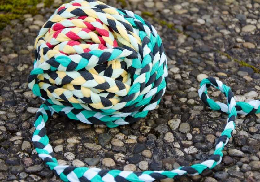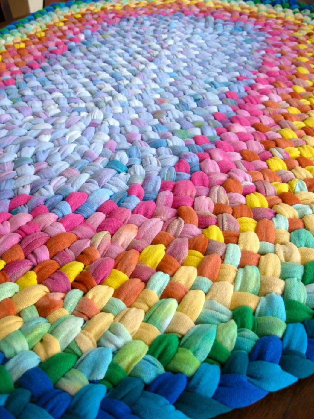 Для создания приятного творения для украшения пола понадобятся ленты из халатов, полотенец, простынок. Отдельные кусочки соединяют в длинные ленты, которые потом используют для плетения обычной косички.