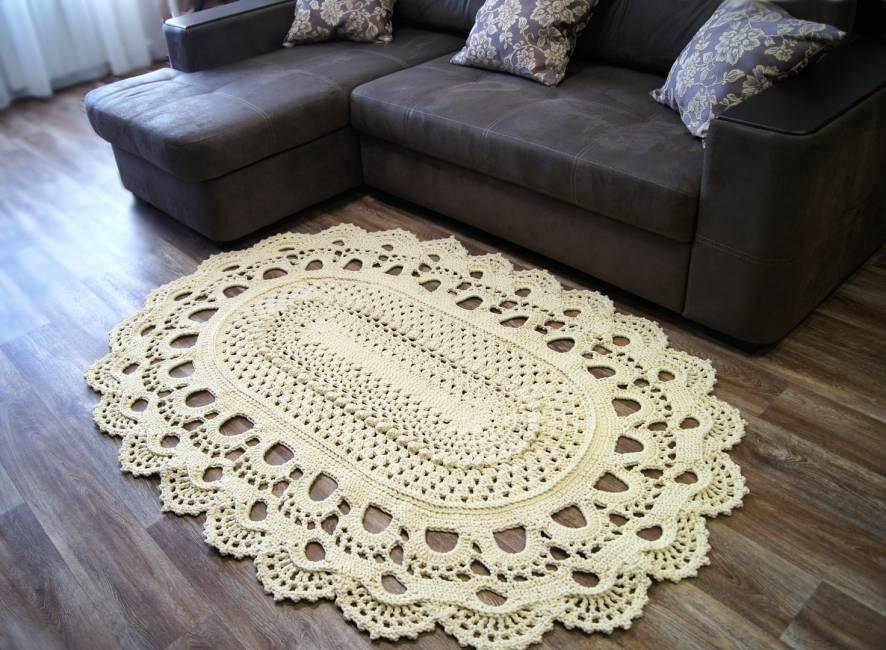 Пряжа в гостиную не должна контрастировать с оттенком пола. Подбирается изделие в тон с полом или схожего оттенка. Если в комнате стены оформлены в светлых тонах, то пряжа подбирается в холодных оттенках. Если стены, напротив, в темных тонах, лучше выбрать изделие коричневого цвета с орнаментом или бежевого.
