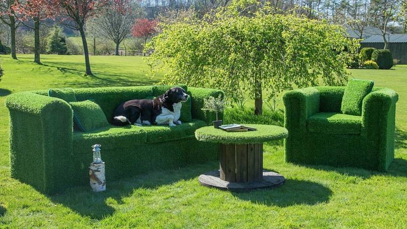 Красиво и необычно смотрится мебель, обтянутая искусственной травой. Зелёное мягкое кресло, диван станет необычным украшением комнаты. А журнальный столик, столешница которого будет закрыта искусственной травой, станет похож на островок сочной растительности. Если смело экспериментировать в этом направлении, получится создать эксклюзивный интерьер.