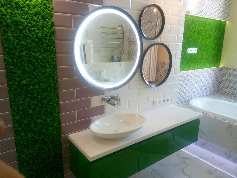 В ванной комнате также уместна «зеленая лужайка». Но для данного помещения нужно выбирать материалы, которые хорошо впитывают воду и быстро сохнут. В качестве них хорошо подойдут хлопок и бамбук.