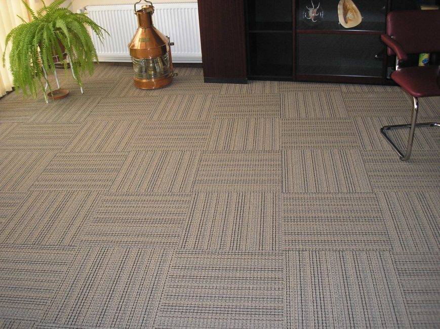 Ковровая плитка интересно контрастирует с ламинатом и другими поверхностями, может быть использована в нескольких вариантах сразу.