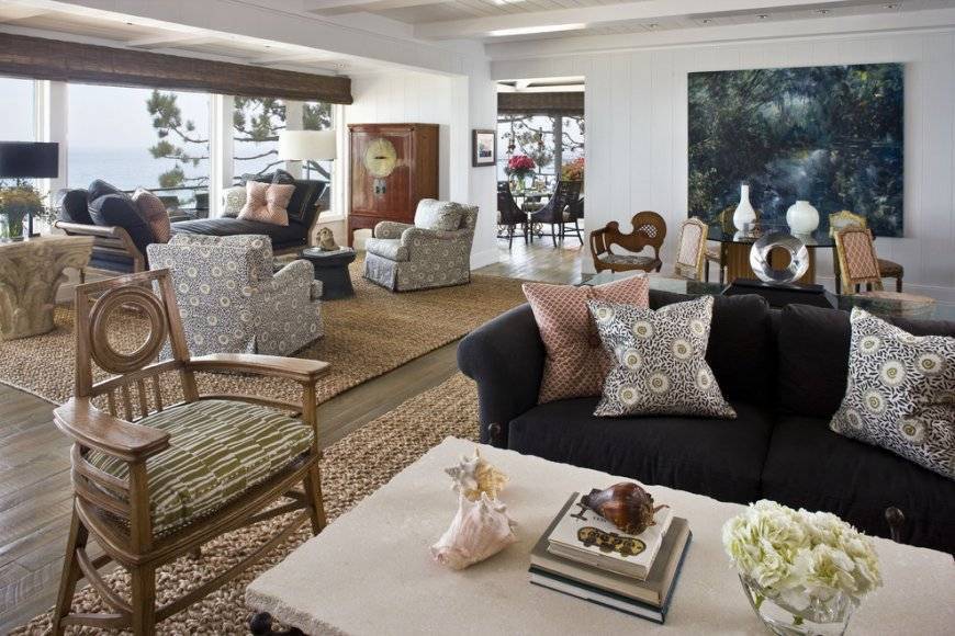 Такого же эффекта можно добиться с помощью овального ковра. Крупный рисунок более уместен в просторном помещении, так как зрительно уменьшит его.