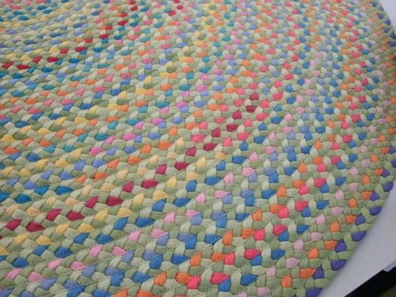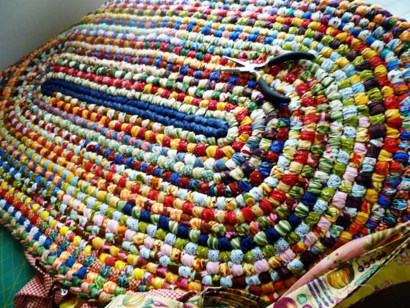 Каждый добавленный оборот пришивают к предыдущему, чтобы изделие не распалось. Это можно делать по ходу сворачивания или сначала скрепить булавками, а прошить после. Если косички равной длины выложить в ряд, получится прямоугольный плетеный коврик, в этом случае придется потрудиться над закреплением свободных концов. Верхняя сторона, по которой проходят швы, будет нижней частью и скроется под подкладкой, необходимой для прочности и сохранения формы.