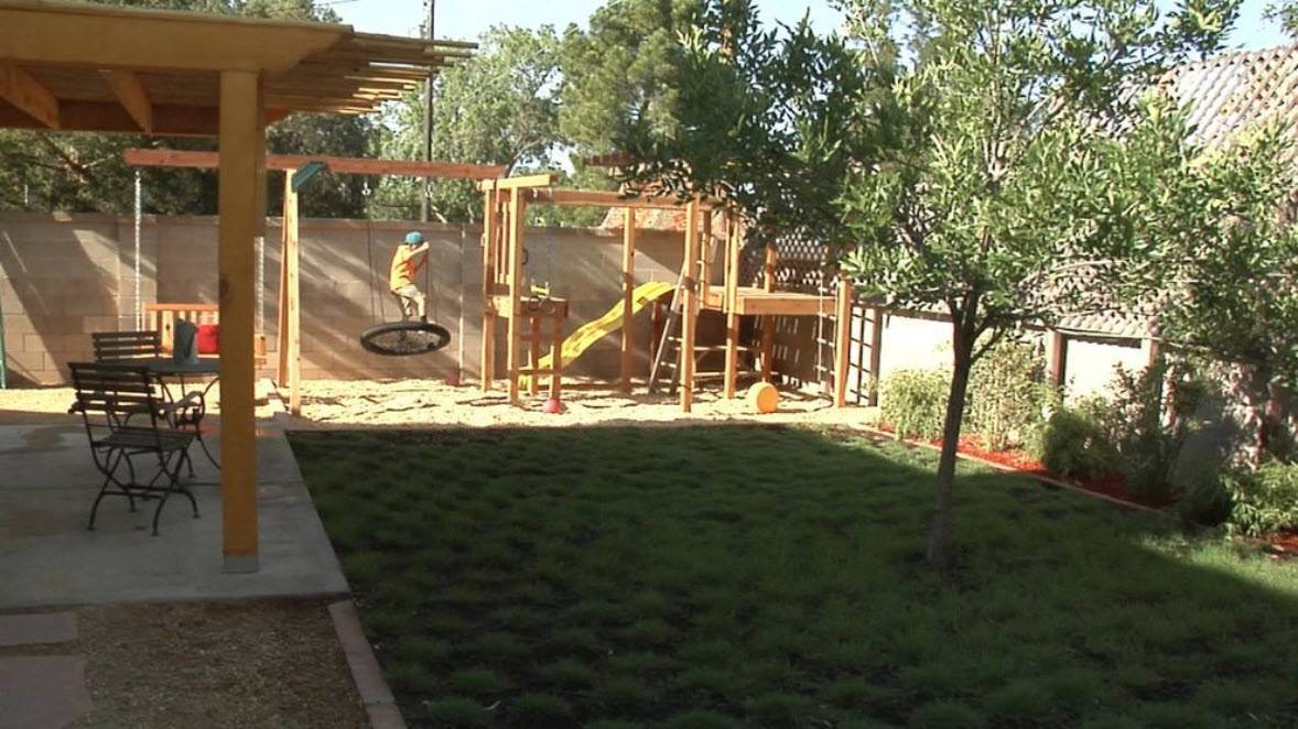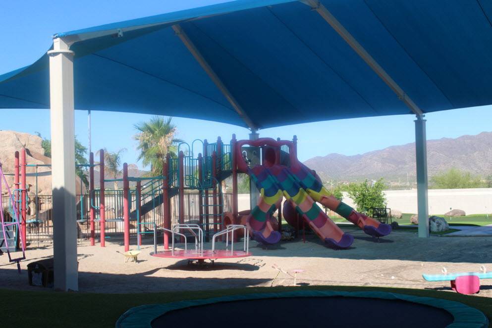 Этот вариант является востребованным среди семей с ребенком, что любит играться на свежем воздухе. Всем известно, что даже в плохую погоду ребенка достаточно сложно удержать в доме, а значит, следует сконструировать специальный навес, расположить его над песочницей, качелями или турниками для того, чтобы оградить ребенка от «капризов» погоды. Также стоит отметить, что навес продлит срок службы игровой зоны, защитив деревянные постройки площадки от осадков.