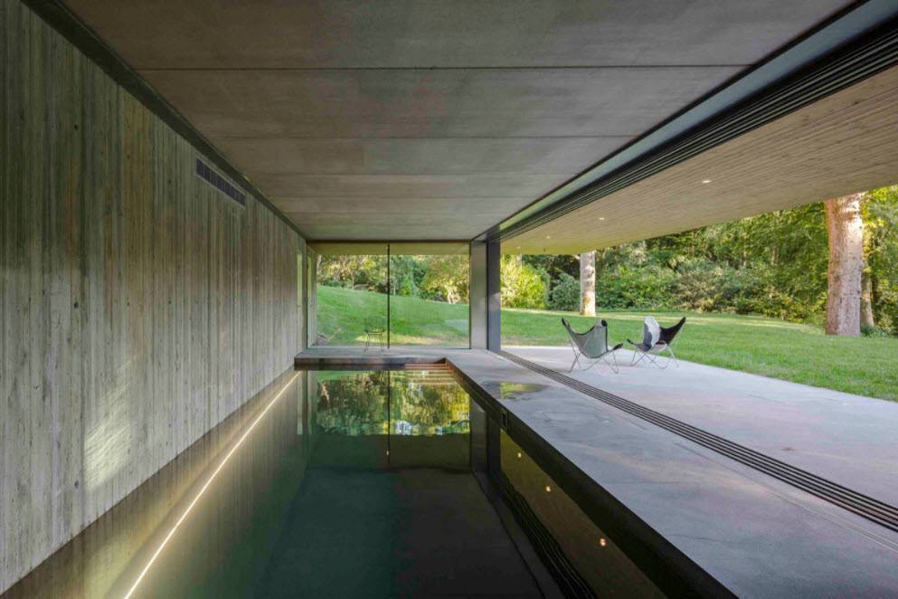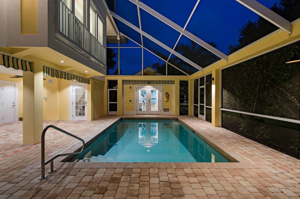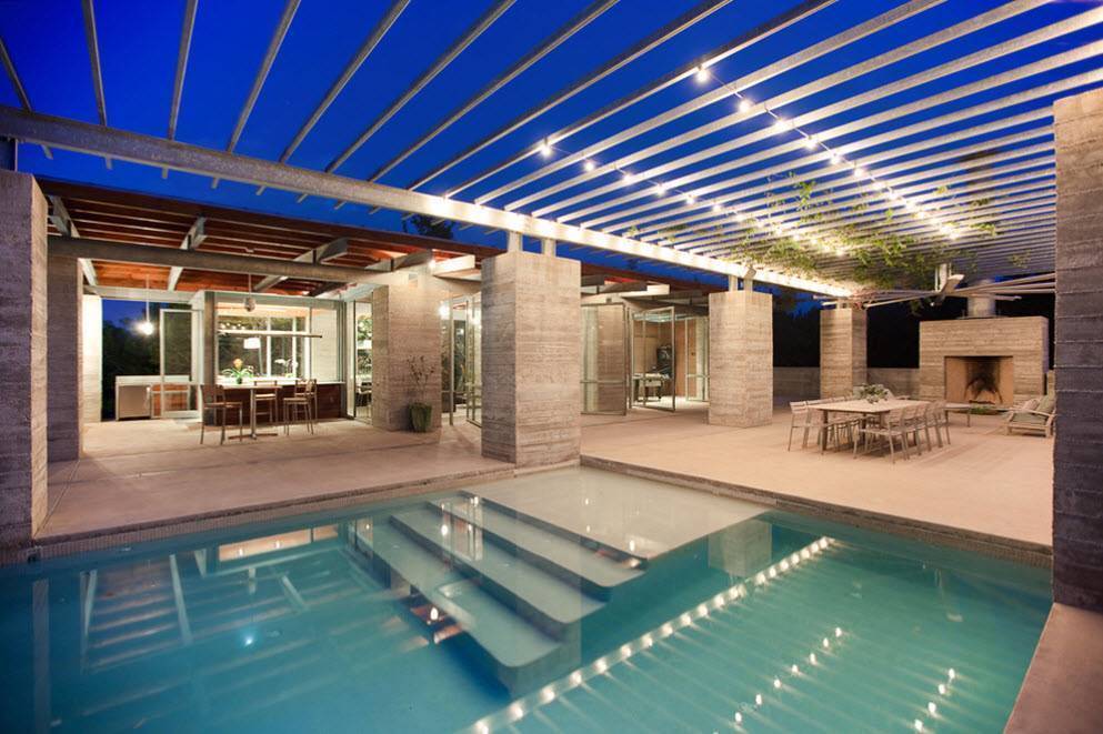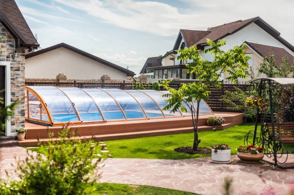 При таком типе навеса лучше всего будет конструировать закрытий вариант «тепличного» вида. Если в конструкции использовать раздвижные элементы, то ими можно будет управлять, открывая секции в жаркое время и закрывая их во время ветра или дождя. Оптимальным вариантом будут прозрачные покрытия, которые не помешают обзору и создадут приятное эстетическое впечатление.