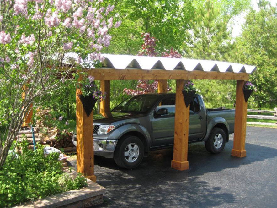 Так как данный навес фактически является дополнительной частью дома, выполняют его из материалов, соответствующих основной постройке. Если дом деревянный, то и навес выполняется из бруса, если же кирпичный, то подойдет металлическое покрытие