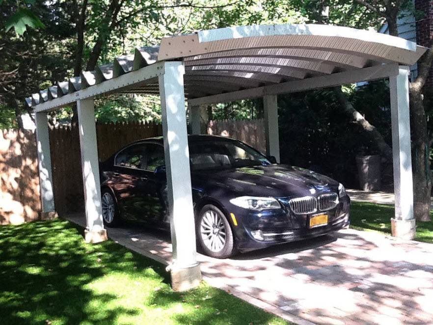 В независимости от функций навеса он не имеет чересчур сложной конструкции, состоящей из опоры, каркаса и крыши. Материалы необходимо выбирать в соответствии со стилем дома и общего ландшафтного дизайна. В качестве опор можно использовать деревянные брусья, кирпичные столбики или стальные трубы. Для каркаса лучше всего использовать дерево или металлопрофиль. Для кровли используется материал, аналогичный тем, что использовался на других строениях. Оптимальными вариантами кровли будут: пластик, поликарбонат, профнастил и металлочерепица.