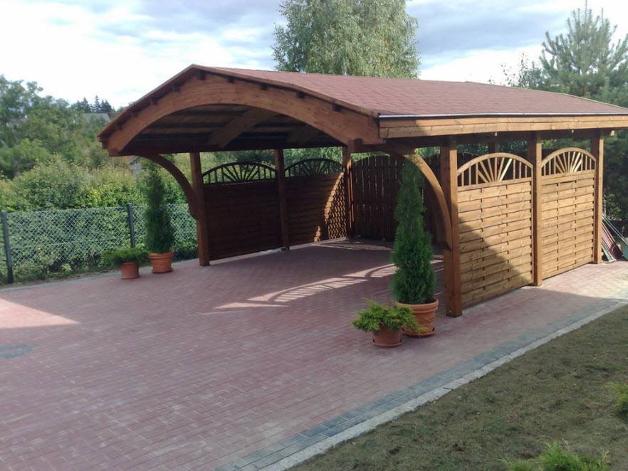 Это оптимальный вариант постройки для тех, кто не имеет достаточно свободного пространства на территории частного дома и не может позволить себе постройку гаража. Также такие навесы могут послужить защитой для автомобилей гостей, которые будут спокойны за свое авто, поставив его под специальный навес. Основное преимущество этого навеса – экономическая выгода, ведь построить гараж значительно сложнее и дорого по финансам.