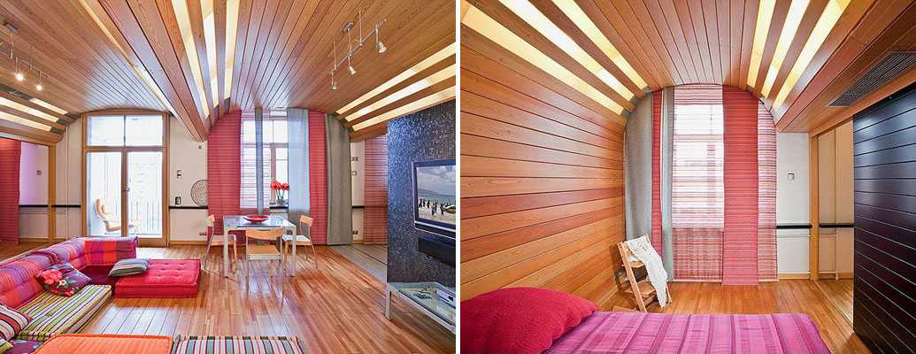 Потолок из вагонки органично смотрится в пространстве современного лофта. Такой прием немного визуально опускает потолок, чего, собственно, и хотел добиться дизайнер этого проекта.