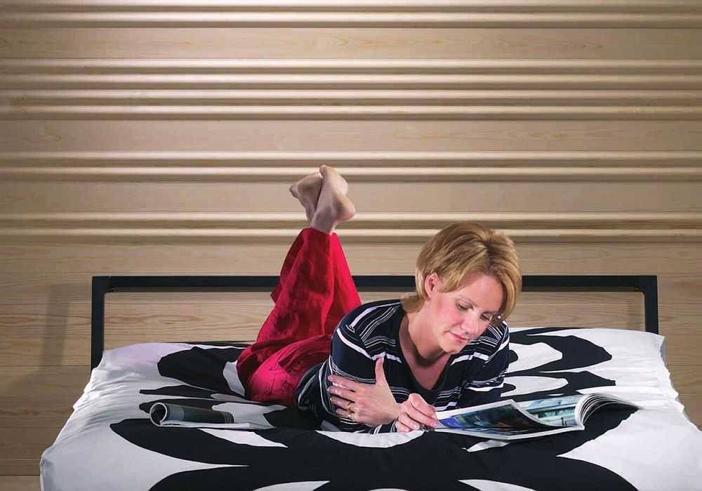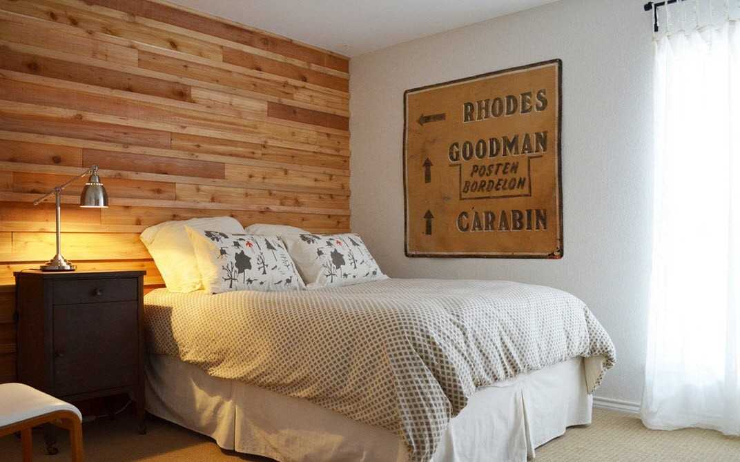 При помощи вагонки можно также создать акцентную стену, например за кроватью в спальне. Для этого лучше выбрать текстурированную вагонку — интерьер станет выглядеть еще эффектнее при искусственном освещении за счет игры света и тени на акцентной стене.