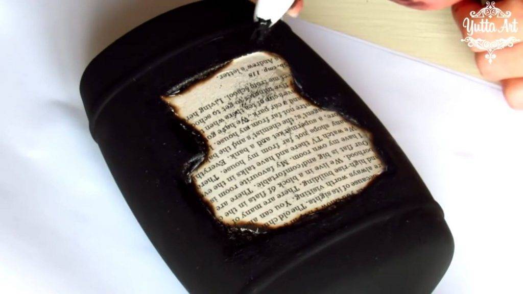 Снова обрабатываем поверхность бутылки лаком. Если есть отдельные вырванные кусочки изображения, аккуратно состыковываем их с основным фрагментом и также обрабатываем лаком.