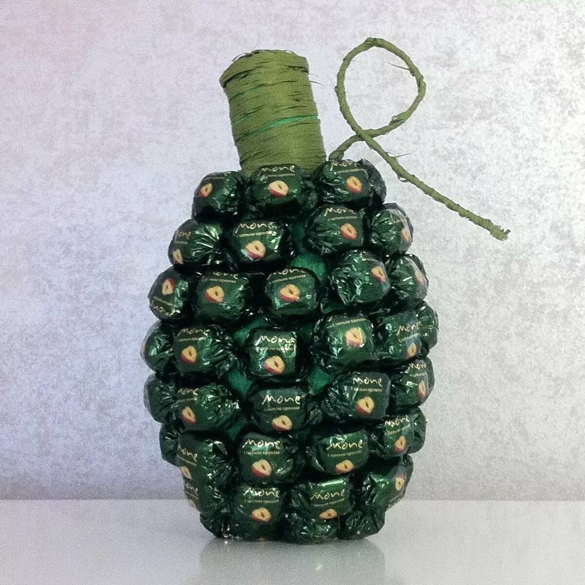 С помощью клея-пистолета прикрепляем конфеты на бутылку, начиная снизу, в шахматном порядке, как можно плотнее друг к дружке. Когда весь сладкий ассортимент присоединен (границей служит начало горлышка бутылки), вырезаем листья для декора верхней части «фрукта». Учтите, что листья должны превосходить по размеру высоту оставшейся части бутылки, закрывая пышной растительностью все горлышко и даже пробку. На данном этапе, чем гуще «шевелюра» ананаса — тем лучше. Осталось только декорировать веревкой то место, где встречаются конфеты и листья. Для этого нужно обмотать ею горлышко более десяти раз в зависимости от ширины стыка. По желанию можно добавить бант или другой декоративный элемент.