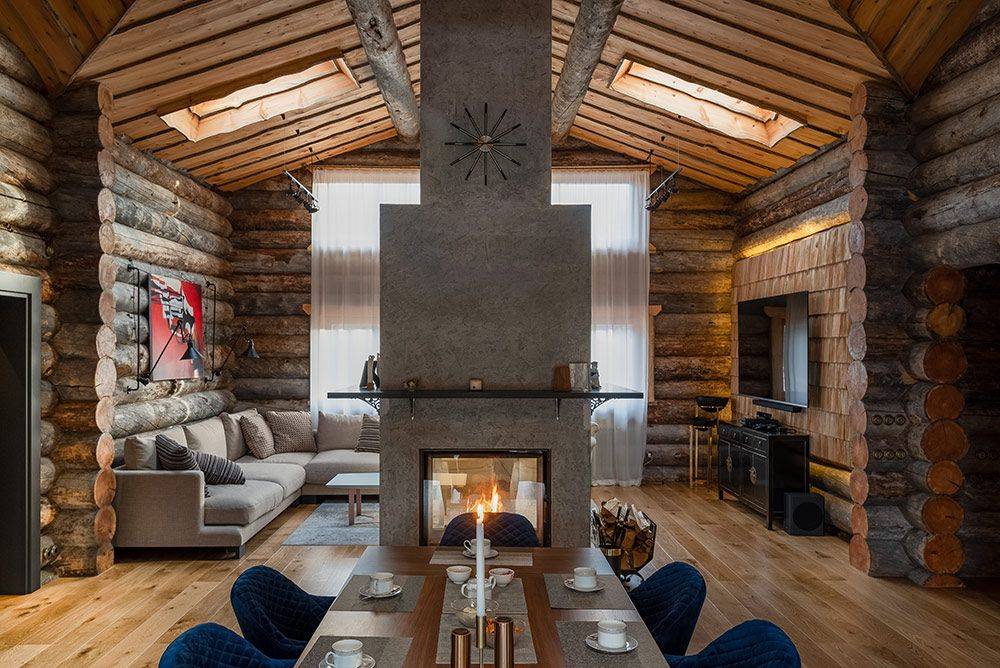 Стиль альпийского шале в котором четко проглядываются черты «минимализма для миллионеров». Использованы дорогие, натуральные материалы. Центр – композиции – гигантское панорамное окно.