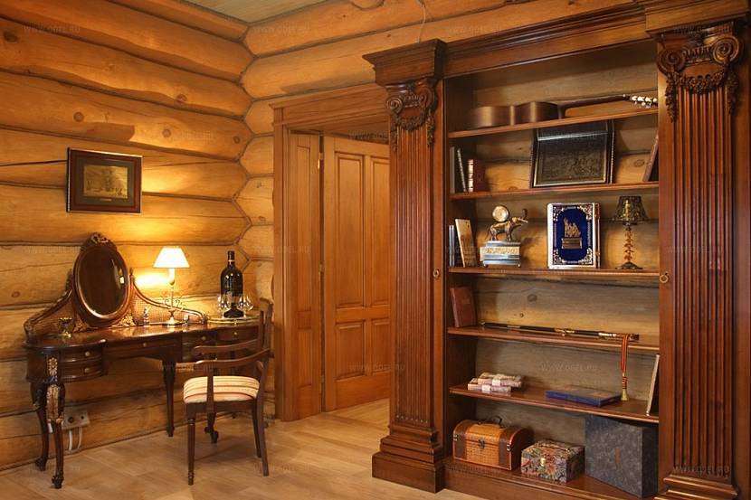Интерьер кабинета в доме из бревен в русском стилеИсточник usproekt.ru