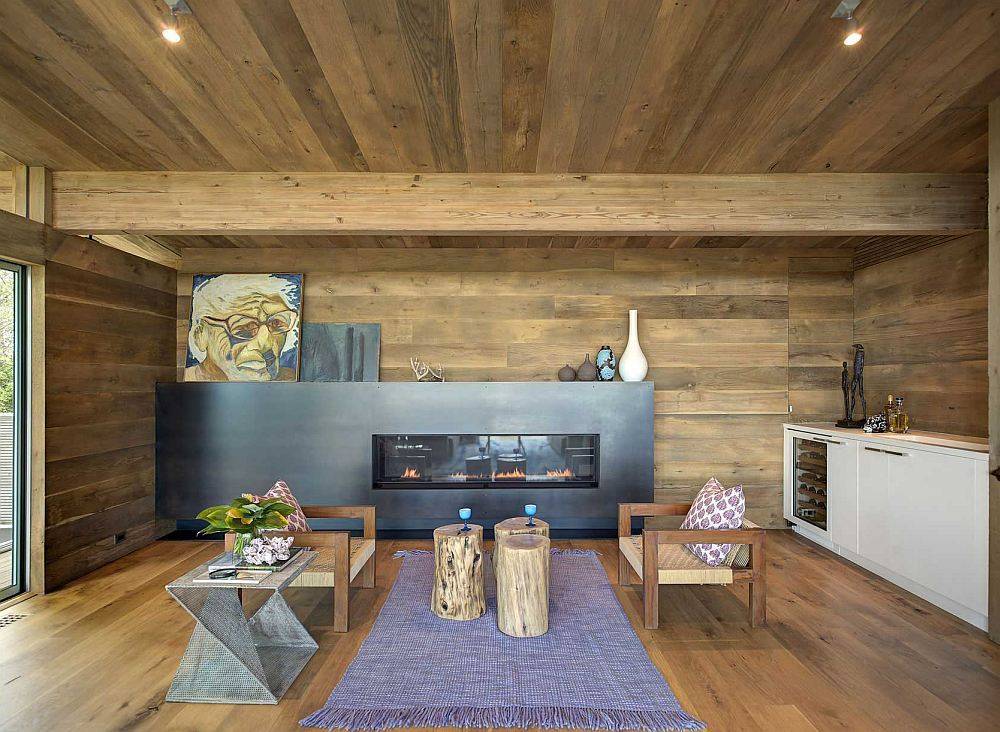 Применение реечного способа отделки вертикальных поверхностей часто встречается в современных коттеджах