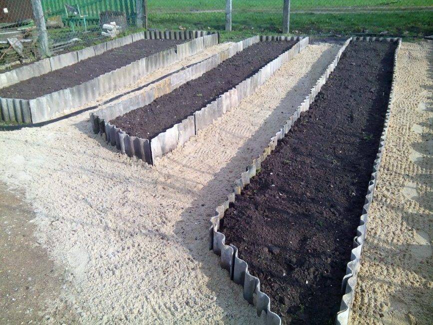 Если есть шифер — работа по обустройству грядки будет легкой. Его нарезают на полосы нужной ширины с учетом того, что сантиметров 10 нужно будет закопать. Для экономии материала есть второй вариант: вбить колышки в грунт, а к колышкам прикрутить саморезами (прибить гвоздями) шифер, нижний край которого просто чуть утопить в плодородный слой.