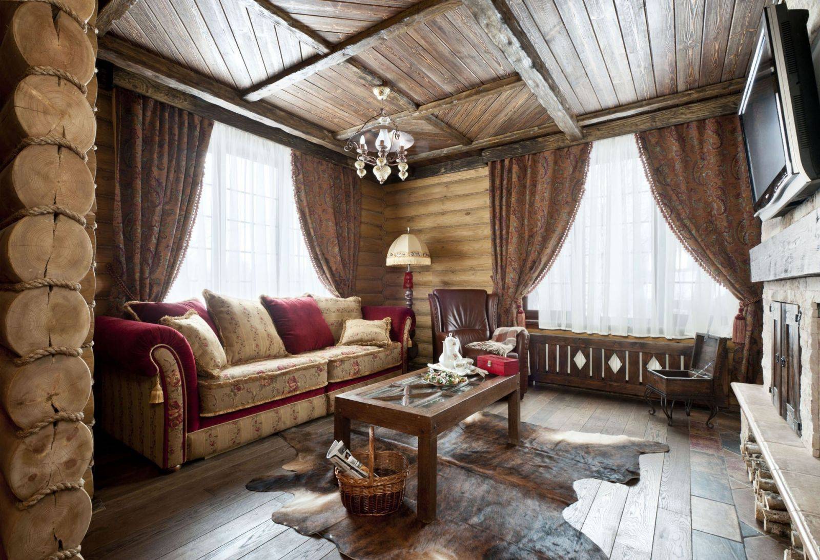 Выбор этого критерия немаловажен, ведь интерьер деревянного дома отличается от привычного нам интерьера городских квартир. Деревянные стены и полы предполагают теплую атмосферу деревенского домика или респектабельного шале. Цветовая гамма здесь разнообразна, но натуральна. Сюда не подойдут цвета электрик и неон, синтетика будет смотреться нелепо и кричаще. Следует быть аккуратнее и с элементами декора, сложным орнаментом и узорами.