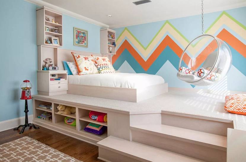 Если пространство позволяет, то можно обустроить детскую зону для игр. Почерпнуть идеи помогут фото спальни в частном доме, приведенные ниже.