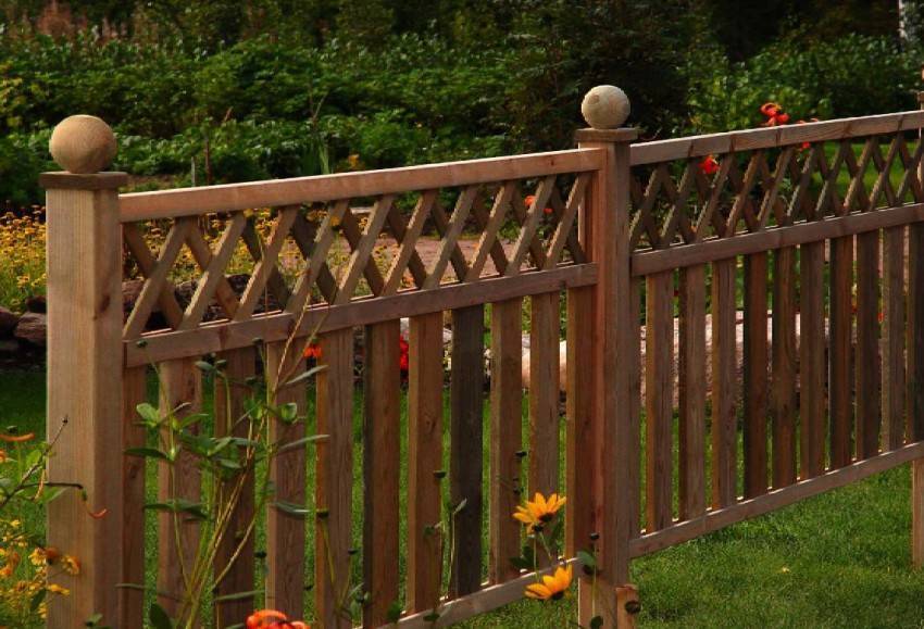 - Решетка — это декоративный вид забора. Доски могут располагаться как прямо, так и под углом. Такая изгородь чаще всего используется для украшения участка.